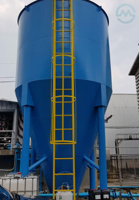 เมื่อได้ปรับสภาพน้ำโดยการใส่สารปูนขาว และสารส้มเรียบร้อยแล้ว น้ำที่ตกตะกอนในบ่อพักก็ถูกจ่ายไปยังถังตกตะกอนอีกใบนึง เมื่อแหล่งน้ำดิบ หรือน้ำบาดาลได้รับสารเร่งตะกอนก็จะทำให้เกิดการตกตะกอนเป็นก้อนขนาดใหญ่ จนเศษตะกอนเหล่านั้นตกลงสู่ก้นถัง